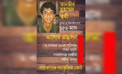 ত্বকীসহ সকল হত্যাকাণ্ডের দ্রুত বিচার এবং বৈষম্যমূলক বিচার ব্যবস্থার অবসানের দাবিতে নারায়ণগঞ্জ সাংস্কৃতিক জোট আগামী ৮ নভেম্বর ২০২৫, শনিবার সন্ধ্যা ছয়টায় নারায়ণগঞ্জ কেন্দ্রীয় শহীদ মিনারে এক আলোক প্রজ্বলন কর্মসূচির আয়োজন করেছে। এই কর্মসূচিতে নারায়ণগঞ্জবাসীসহ সুশীল সমাজের প্রতিনিধিরা উপস্থিত থাকবেন বলে আশা করা হচ্ছে।
