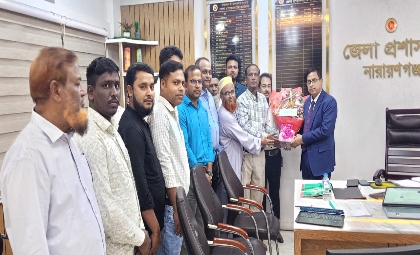 এসময় নবাগত ডিসিকে ফুলেল শুভেচ্ছা জানানো কালে উপস্থিত ছিলেন সরকারী গাড়ি চালক সমিতি নারায়ণগঞ্জ জেলা কমিটির সভাপতি মুকবিল হোসেন মুকুল (মৌলভী) সহ-সভাপতি দেওয়ান মো মোশারফ, সাধারণ সম্পাদক মো জলিল উদ্দিন, যুগ্ম সম্পাদক মিজানুর রহমান, সাংগঠনিক সম্পাদক সফিউল আলম, সহ সাংগঠনিক সম্পাদক মো দেলোয়ার হোসেন, ধর্ম বিষয়ক সম্পাদক মো আবদুল হাই, প্রচার সম্পাদক আবু তাহের রাজু, ক্রিড়া সম্পাদক শরিফ হোসেন কার্যনির্বাহী সদস্য নূর মোহাম্মদ, মোঃ আলীমুজ্জামান ইকবাল, সদস্য মো সুলতান আহমেদ, মো ইকবাল হোসেন, ইমরান হোসেন, মো হায়দার, মো সুজন, মো শিমুল, মো ইসমাইল শেখ সহ অন্যান্য নেতৃবৃন্দ।